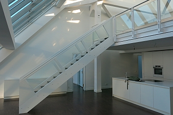 | Projektbeschreibung | Umbau eines ehemaligen Fitnessstudios in den 2 obersten Etagen eines denkmalgeschützten Geschäftshauses zu Wohnzwecken, Ausbau von 2 Wohnungen unterhalb einer Glaskuppel |